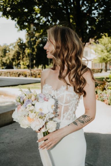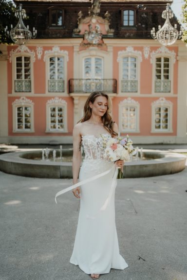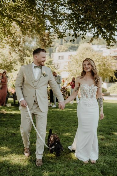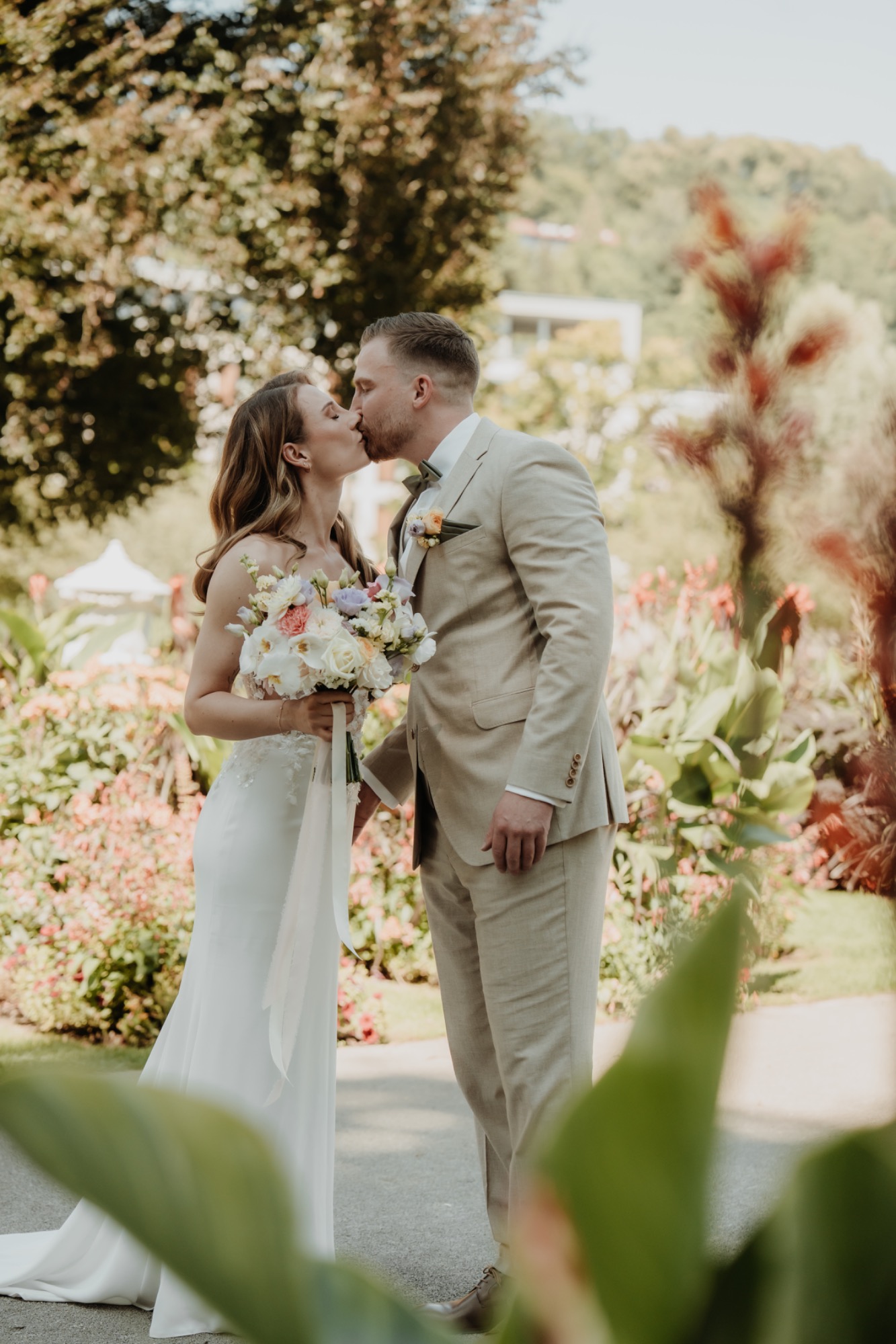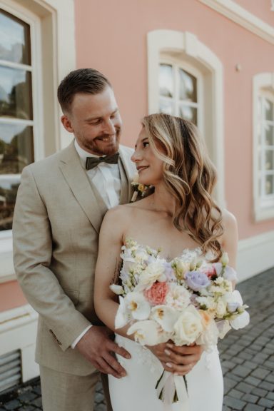 warmes Licht, sanfte Pastelltöne, ein Hauch Leichtigkeit in der Luft. Mittendrin ein Brautpaar, das strahlt, als würden sie die Sonne selbst tragen. Alles fühlt sich frei, leicht und voller guter Vibes an – genau der perfekte Moment, um „Ja“ zu sagen.